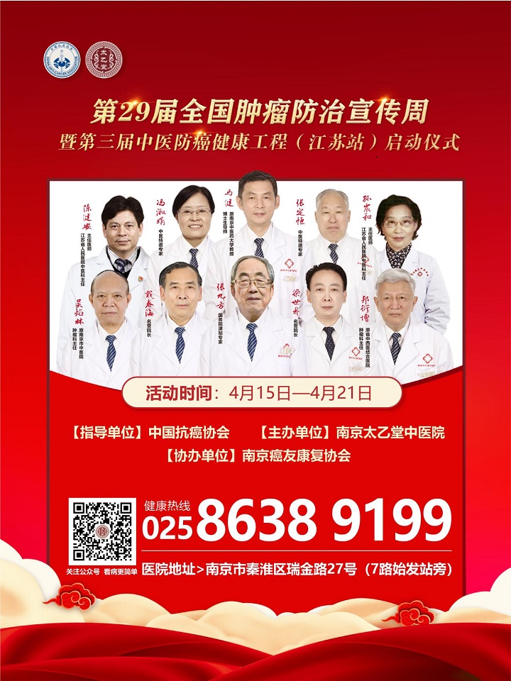 2023年4月15日至4月21日是第29届全国肿瘤防治宣传周,为助力健康江苏,振兴中医药,发挥中医在治疗肿瘤方面的重要作用和优势,在中国抗癌协会指导下,由南京太乙堂中医院主办,南京癌友康复协会协办将于2023年4月15日在南京太乙堂中医院启动第29届全国肿瘤防治宣传周暨中医防癌健康工程活动(江苏站)。